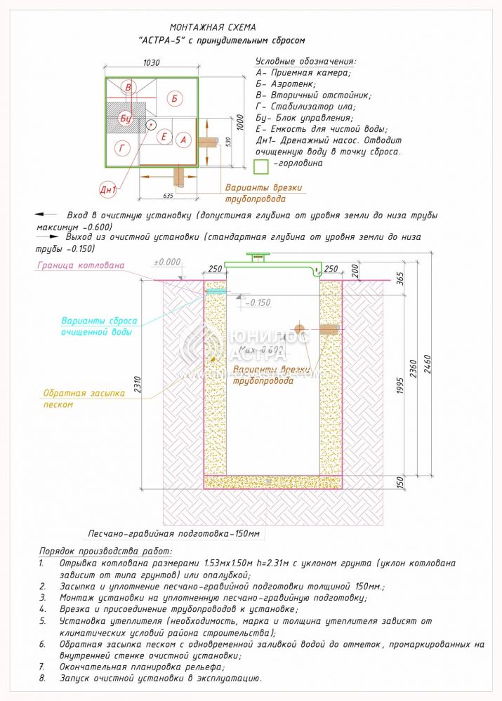 Септик Юнилос Астра 5 ПР представлен в виде вертикального резервуара, разделенного на разнофункциональные отсеки: первичный сборщик нечистот, аэротенк, иловый накопитель и секция сбора остаточных твердых компонентов. В них осуществляется многоэтапная нейтрализация нечистот, которая приводит к получению технически чистой воды на выходе.